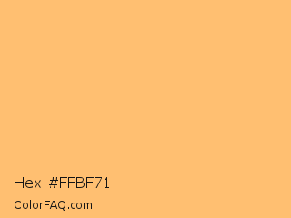 Hex #ffbf71 Color is a light orange color and the nearest color is Macaroni And Cheese #ffb97b. Hex code #ffbf71 and RGB value is rgb(255,191,113). In RGB color space, this color is composed of 100% red, 75% green, 44% blue, In CMYK color space, this color is composed of 0% cyan, 25% magenta, 56% yellow , 0% black , In HSL color space, this color has a hue angle of 33° , 100% saturation and 72% lightness.