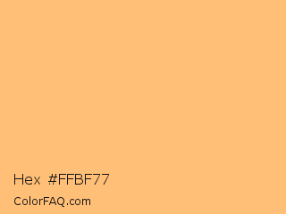 Hex #ffbf77 Color is a light orange color and the nearest color is Macaroni And Cheese #ffb97b. Hex code #ffbf77 and RGB value is rgb(255,191,119). In RGB color space, this color is composed of 100% red, 75% green, 47% blue, In CMYK color space, this color is composed of 0% cyan, 25% magenta, 53% yellow , 0% black , In HSL color space, this color has a hue angle of 32° , 100% saturation and 73% lightness.