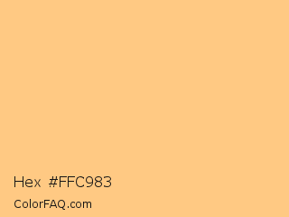 Hex #ffc983 Color is a light orange color and the nearest color is Topaz #ffc87c. Hex code #ffc983 and RGB value is rgb(255,201,131). In RGB color space, this color is composed of 100% red, 79% green, 51% blue, In CMYK color space, this color is composed of 0% cyan, 21% magenta, 49% yellow , 0% black , In HSL color space, this color has a hue angle of 34° , 100% saturation and 76% lightness.