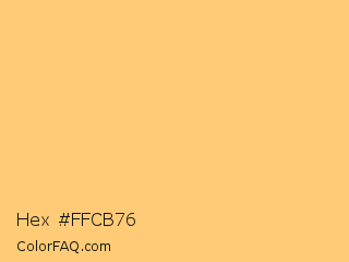 Hex #ffcb76 Color is a light orange color and the nearest color is Topaz #ffc87c. Hex code #ffcb76 and RGB value is rgb(255,203,118). In RGB color space, this color is composed of 100% red, 80% green, 46% blue, In CMYK color space, this color is composed of 0% cyan, 20% magenta, 54% yellow , 0% black , In HSL color space, this color has a hue angle of 37° , 100% saturation and 73% lightness.