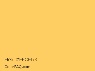 Hex #ffce63 Color is a light orange color and the nearest color is Golden Tainoi #ffcc5c. Hex code #ffce63 and RGB value is rgb(255,206,99). In RGB color space, this color is composed of 100% red, 81% green, 39% blue, In CMYK color space, this color is composed of 0% cyan, 19% magenta, 61% yellow , 0% black , In HSL color space, this color has a hue angle of 41° , 100% saturation and 69% lightness.