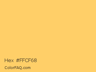 Hex #ffcf68 Color is a light orange color and the nearest color is Goldenrod #fcd667. Hex code #ffcf68 and RGB value is rgb(255,207,104). In RGB color space, this color is composed of 100% red, 81% green, 41% blue, In CMYK color space, this color is composed of 0% cyan, 19% magenta, 59% yellow , 0% black , In HSL color space, this color has a hue angle of 41° , 100% saturation and 70% lightness.