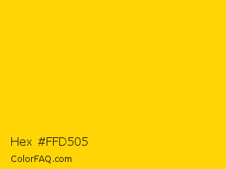 Hex #ffd505 Color is a normal yellow color and the nearest color is Gold #ffd700. Hex code #ffd505 and RGB value is rgb(255,213,5). In RGB color space, this color is composed of 100% red, 84% green, 2% blue, In CMYK color space, this color is composed of 0% cyan, 16% magenta, 98% yellow , 0% black , In HSL color space, this color has a hue angle of 50° , 100% saturation and 51% lightness.