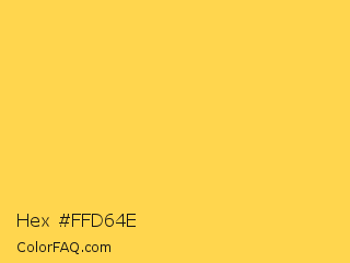 Hex #ffd64e Color is a light yellow color and the nearest color is Mustard #ffdb58. Hex code #ffd64e and RGB value is rgb(255,214,78). In RGB color space, this color is composed of 100% red, 84% green, 31% blue, In CMYK color space, this color is composed of 0% cyan, 16% magenta, 69% yellow , 0% black , In HSL color space, this color has a hue angle of 46° , 100% saturation and 65% lightness.