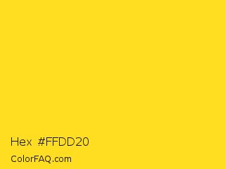 Hex #ffdd20 Color is a normal yellow color and the nearest color is Candlelight #fcd917. Hex code #ffdd20 and RGB value is rgb(255,221,32). In RGB color space, this color is composed of 100% red, 87% green, 13% blue, In CMYK color space, this color is composed of 0% cyan, 13% magenta, 87% yellow , 0% black , In HSL color space, this color has a hue angle of 51° , 100% saturation and 56% lightness.
