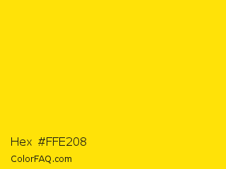 Hex #ffe208 Color is a normal yellow color and the nearest color is Vivid Yellow #ffe302. Hex code #ffe208 and RGB value is rgb(255,226,8). In RGB color space, this color is composed of 100% red, 89% green, 3% blue, In CMYK color space, this color is composed of 0% cyan, 11% magenta, 97% yellow , 0% black , In HSL color space, this color has a hue angle of 53° , 100% saturation and 52% lightness.