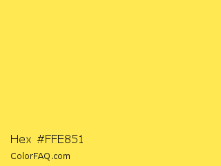 Hex #ffe851 Color is a light yellow color and the nearest color is Gorse #fff14f. Hex code #ffe851 and RGB value is rgb(255,232,81). In RGB color space, this color is composed of 100% red, 91% green, 32% blue, In CMYK color space, this color is composed of 0% cyan, 9% magenta, 68% yellow , 0% black , In HSL color space, this color has a hue angle of 52° , 100% saturation and 66% lightness.