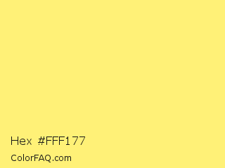 Hex #fff177 Color is a light yellow color and the nearest color is Paris Daisy #fff46e. Hex code #fff177 and RGB value is rgb(255,241,119). In RGB color space, this color is composed of 100% red, 95% green, 47% blue, In CMYK color space, this color is composed of 0% cyan, 5% magenta, 53% yellow , 0% black , In HSL color space, this color has a hue angle of 54° , 100% saturation and 73% lightness.