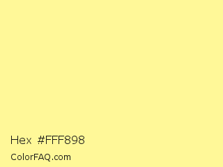Hex #fff898 Color is a light yellow color and the nearest color is Witch Haze #fffc99. Hex code #fff898 and RGB value is rgb(255,248,152). In RGB color space, this color is composed of 100% red, 97% green, 60% blue, In CMYK color space, this color is composed of 0% cyan, 3% magenta, 40% yellow , 0% black , In HSL color space, this color has a hue angle of 56° , 100% saturation and 80% lightness.