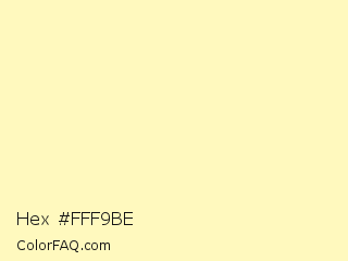Hex #fff9be Color is a very light yellow color and the nearest color is Very Pale Yellow #ffffbf. Hex code #fff9be and RGB value is rgb(255,249,190). In RGB color space, this color is composed of 100% red, 98% green, 75% blue, In CMYK color space, this color is composed of 0% cyan, 2% magenta, 25% yellow , 0% black , In HSL color space, this color has a hue angle of 54° , 100% saturation and 87% lightness.