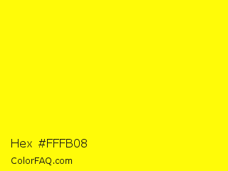 Hex #fffb08 Color is a normal yellow color and the nearest color is Yellow #ffff00. Hex code #fffb08 and RGB value is rgb(255,251,8). In RGB color space, this color is composed of 100% red, 98% green, 3% blue, In CMYK color space, this color is composed of 0% cyan, 2% magenta, 97% yellow , 0% black , In HSL color space, this color has a hue angle of 59° , 100% saturation and 52% lightness.
