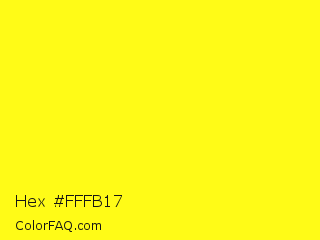Hex #fffb17 Color is a normal yellow color and the nearest color is Broom #ffec13. Hex code #fffb17 and RGB value is rgb(255,251,23). In RGB color space, this color is composed of 100% red, 98% green, 9% blue, In CMYK color space, this color is composed of 0% cyan, 2% magenta, 91% yellow , 0% black , In HSL color space, this color has a hue angle of 59° , 100% saturation and 55% lightness.