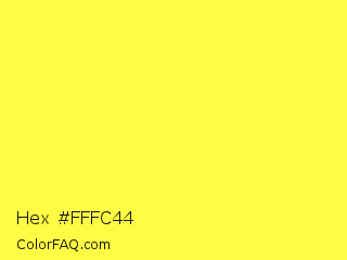 Hex #fffc44 Color is a light yellow color and the nearest color is Golden Fizz #f5fb3d. Hex code #fffc44 and RGB value is rgb(255,252,68). In RGB color space, this color is composed of 100% red, 99% green, 27% blue, In CMYK color space, this color is composed of 0% cyan, 1% magenta, 73% yellow , 0% black , In HSL color space, this color has a hue angle of 59° , 100% saturation and 63% lightness.