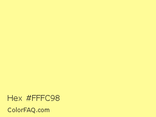 Hex #fffc98 Color is a light yellow color and the nearest color is Witch Haze #fffc99. Hex code #fffc98 and RGB value is rgb(255,252,152). In RGB color space, this color is composed of 100% red, 99% green, 60% blue, In CMYK color space, this color is composed of 0% cyan, 1% magenta, 40% yellow , 0% black , In HSL color space, this color has a hue angle of 58° , 100% saturation and 80% lightness.