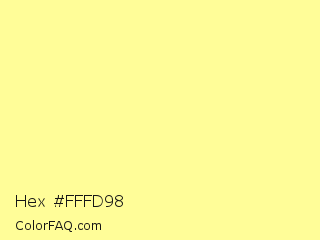 Hex #fffd98 Color is a light yellow color and the nearest color is Witch Haze #fffc99. Hex code #fffd98 and RGB value is rgb(255,253,152). In RGB color space, this color is composed of 100% red, 99% green, 60% blue, In CMYK color space, this color is composed of 0% cyan, 1% magenta, 40% yellow , 0% black , In HSL color space, this color has a hue angle of 59° , 100% saturation and 80% lightness.