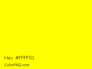 Hex #ffff01 Color is a normal yellow color and the nearest color is Yellow #ffff00. Hex code #ffff01 and RGB value is rgb(255,255,1). In RGB color space, this color is composed of 100% red, 100% green, 0% blue, In CMYK color space, this color is composed of 0% cyan, 0% magenta, 100% yellow , 0% black , In HSL color space, this color has a hue angle of 60° , 100% saturation and 50% lightness.