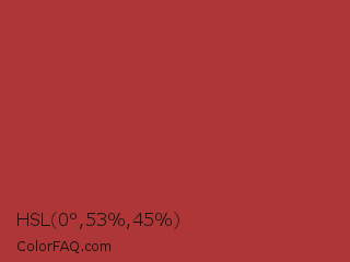 HSL 0°,53%,45% Color is a normal red color and the nearest color is Well Read #b43332. Hex code #af3636 and RGB value is rgb(175,54,54). In RGB color space, this color is composed of 69% red, 21% green, 21% blue, In CMYK color space, this color is composed of 0% cyan, 69% magenta, 69% yellow , 31% black , In HSL color space, this color has a hue angle of 0° , 53% saturation and 45% lightness.