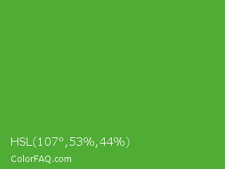 HSL 107°,53%,44% Color is a normal green color and the nearest color is Apple #4fa83d. Hex code #4fac35 and RGB value is rgb(79,172,53). In RGB color space, this color is composed of 31% red, 67% green, 21% blue, In CMYK color space, this color is composed of 54% cyan, 0% magenta, 69% yellow , 33% black , In HSL color space, this color has a hue angle of 107° , 53% saturation and 44% lightness.