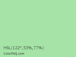 HSL 122°,53%,77% Color is a light green color and the nearest color is Granny Smith Apple #a8e4a0. Hex code #a5e3a7 and RGB value is rgb(165,227,167). In RGB color space, this color is composed of 65% red, 89% green, 65% blue, In CMYK color space, this color is composed of 27% cyan, 0% magenta, 26% yellow , 11% black , In HSL color space, this color has a hue angle of 122° , 53% saturation and 77% lightness.