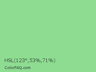 HSL 123°,53%,71% Color is a light green color and the nearest color is Granny Smith Apple Crayola #9de093. Hex code #8edc92 and RGB value is rgb(142,220,146). In RGB color space, this color is composed of 56% red, 86% green, 57% blue, In CMYK color space, this color is composed of 35% cyan, 0% magenta, 34% yellow , 14% black , In HSL color space, this color has a hue angle of 123° , 53% saturation and 71% lightness.
