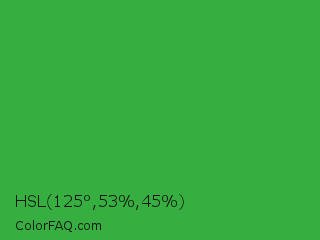 HSL 125°,53%,45% Color is a normal green color and the nearest color is Wageningen Green #34b233. Hex code #36af40 and RGB value is rgb(54,175,64). In RGB color space, this color is composed of 21% red, 69% green, 25% blue, In CMYK color space, this color is composed of 69% cyan, 0% magenta, 63% yellow , 31% black , In HSL color space, this color has a hue angle of 125° , 53% saturation and 45% lightness.