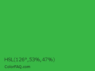 HSL 126°,53%,47% Color is a normal green color and the nearest color is Wageningen Green #34b233. Hex code #38b745 and RGB value is rgb(56,183,69). In RGB color space, this color is composed of 22% red, 72% green, 27% blue, In CMYK color space, this color is composed of 69% cyan, 0% magenta, 62% yellow , 28% black , In HSL color space, this color has a hue angle of 126° , 53% saturation and 47% lightness.
