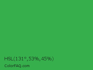 HSL 131°,53%,45% Color is a normal green color and the nearest color is Chateau Green #40a860. Hex code #36af4c and RGB value is rgb(54,175,76). In RGB color space, this color is composed of 21% red, 69% green, 30% blue, In CMYK color space, this color is composed of 69% cyan, 0% magenta, 57% yellow , 31% black , In HSL color space, this color has a hue angle of 131° , 53% saturation and 45% lightness.