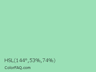HSL 144°,53%,74% Color is a light green color and the nearest color is Teal Deer #99e6b3. Hex code #9ae0b6 and RGB value is rgb(154,224,182). In RGB color space, this color is composed of 60% red, 88% green, 71% blue, In CMYK color space, this color is composed of 31% cyan, 0% magenta, 19% yellow , 12% black , In HSL color space, this color has a hue angle of 144° , 53% saturation and 74% lightness.