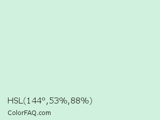 HSL 144°,53%,88% Color is a very light green color and the nearest color is Blue Romance #d2f6de. Hex code #d0f1dd and RGB value is rgb(208,241,221). In RGB color space, this color is composed of 82% red, 95% green, 87% blue, In CMYK color space, this color is composed of 14% cyan, 0% magenta, 8% yellow , 5% black , In HSL color space, this color has a hue angle of 144° , 53% saturation and 88% lightness.