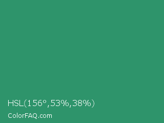 HSL 156°,53%,38% Color is a normal green color and the nearest color is Illuminating Emerald #319177. Hex code #2e946b and RGB value is rgb(46,148,107). In RGB color space, this color is composed of 18% red, 58% green, 42% blue, In CMYK color space, this color is composed of 69% cyan, 0% magenta, 28% yellow , 42% black , In HSL color space, this color has a hue angle of 156° , 53% saturation and 38% lightness.