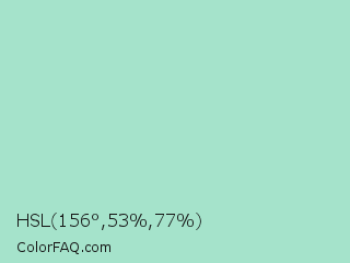 HSL 156°,53%,77% Color is a light green color and the nearest color is Padua #ade6c4. Hex code #a5e3cb and RGB value is rgb(165,227,203). In RGB color space, this color is composed of 65% red, 89% green, 80% blue, In CMYK color space, this color is composed of 27% cyan, 0% magenta, 11% yellow , 11% black , In HSL color space, this color has a hue angle of 156° , 53% saturation and 77% lightness.