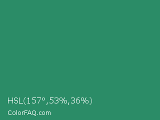 HSL 157°,53%,36% Color is a normal green color and the nearest color is Eucalyptus #278a5b. Hex code #2b8c67 and RGB value is rgb(43,140,103). In RGB color space, this color is composed of 17% red, 55% green, 40% blue, In CMYK color space, this color is composed of 69% cyan, 0% magenta, 26% yellow , 45% black , In HSL color space, this color has a hue angle of 157° , 53% saturation and 36% lightness.
