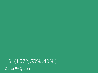 HSL 157°,53%,40% Color is a normal green color and the nearest color is Illuminating Emerald #319177. Hex code #309c73 and RGB value is rgb(48,156,115). In RGB color space, this color is composed of 19% red, 61% green, 45% blue, In CMYK color space, this color is composed of 69% cyan, 0% magenta, 26% yellow , 39% black , In HSL color space, this color has a hue angle of 157° , 53% saturation and 40% lightness.