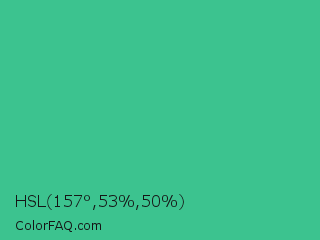 HSL 157°,53%,50% Color is a normal green color and the nearest color is Ocean Green #48bf91. Hex code #3cc38f and RGB value is rgb(60,195,143). In RGB color space, this color is composed of 24% red, 76% green, 56% blue, In CMYK color space, this color is composed of 69% cyan, 0% magenta, 27% yellow , 24% black , In HSL color space, this color has a hue angle of 157° , 53% saturation and 50% lightness.