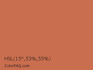 HSL 15°,53%,55% Color is a normal color and the nearest color is Copper Red #cb6d51. Hex code #c96e4f and RGB value is rgb(201,110,79). In RGB color space, this color is composed of 79% red, 43% green, 31% blue, In CMYK color space, this color is composed of 0% cyan, 45% magenta, 61% yellow , 21% black , In HSL color space, this color has a hue angle of 15° , 53% saturation and 55% lightness.