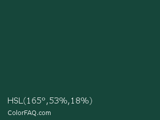 HSL 165°,53%,18% Color is a very dark cyan color and the nearest color is MSU Green #18453b. Hex code #16463a and RGB value is rgb(22,70,58). In RGB color space, this color is composed of 9% red, 27% green, 23% blue, In CMYK color space, this color is composed of 69% cyan, 0% magenta, 17% yellow , 73% black , In HSL color space, this color has a hue angle of 165° , 53% saturation and 18% lightness.