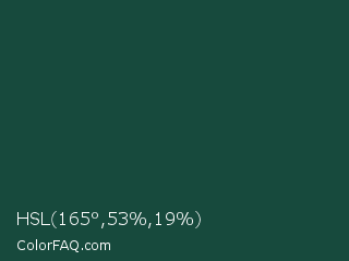 HSL 165°,53%,19% Color is a very dark cyan color and the nearest color is Brunswick Green #1b4d3e. Hex code #174a3d and RGB value is rgb(23,74,61). In RGB color space, this color is composed of 9% red, 29% green, 24% blue, In CMYK color space, this color is composed of 69% cyan, 0% magenta, 18% yellow , 71% black , In HSL color space, this color has a hue angle of 165° , 53% saturation and 19% lightness.