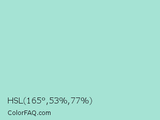HSL 165°,53%,77% Color is a light cyan color and the nearest color is Aqua Island #a1dad7. Hex code #a5e3d4 and RGB value is rgb(165,227,212). In RGB color space, this color is composed of 65% red, 89% green, 83% blue, In CMYK color space, this color is composed of 27% cyan, 0% magenta, 7% yellow , 11% black , In HSL color space, this color has a hue angle of 165° , 53% saturation and 77% lightness.