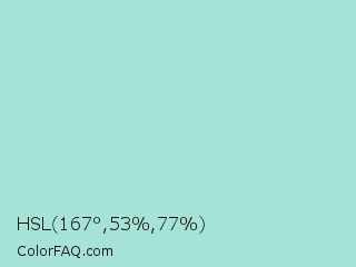 HSL 167°,53%,77% Color is a light cyan color and the nearest color is Aqua Island #a1dad7. Hex code #a5e3d6 and RGB value is rgb(165,227,214). In RGB color space, this color is composed of 65% red, 89% green, 84% blue, In CMYK color space, this color is composed of 27% cyan, 0% magenta, 6% yellow , 11% black , In HSL color space, this color has a hue angle of 167° , 53% saturation and 77% lightness.