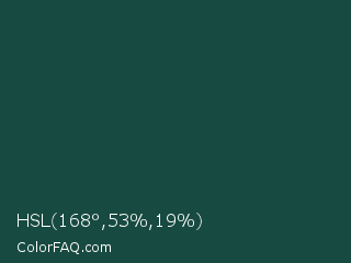 HSL 168°,53%,19% Color is a very dark cyan color and the nearest color is Brunswick Green #1b4d3e. Hex code #174a40 and RGB value is rgb(23,74,64). In RGB color space, this color is composed of 9% red, 29% green, 25% blue, In CMYK color space, this color is composed of 69% cyan, 0% magenta, 14% yellow , 71% black , In HSL color space, this color has a hue angle of 168° , 53% saturation and 19% lightness.