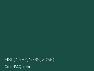HSL 168°,53%,20% Color is a very dark cyan color and the nearest color is Brunswick Green #1b4d3e. Hex code #184e43 and RGB value is rgb(24,78,67). In RGB color space, this color is composed of 9% red, 31% green, 26% blue, In CMYK color space, this color is composed of 69% cyan, 0% magenta, 14% yellow , 69% black , In HSL color space, this color has a hue angle of 168° , 53% saturation and 20% lightness.