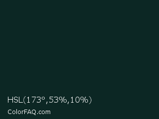 HSL 173°,53%,10% Color is a very dark cyan color and the nearest color is Bush #0d2e1c. Hex code #0c2724 and RGB value is rgb(12,39,36). In RGB color space, this color is composed of 5% red, 15% green, 14% blue, In CMYK color space, this color is composed of 69% cyan, 0% magenta, 8% yellow , 85% black , In HSL color space, this color has a hue angle of 173° , 53% saturation and 10% lightness.