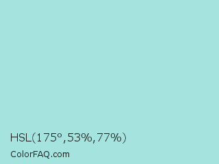 HSL 175°,53%,77% Color is a light cyan color and the nearest color is Water Leaf #a1e9de. Hex code #a5e3de and RGB value is rgb(165,227,222). In RGB color space, this color is composed of 65% red, 89% green, 87% blue, In CMYK color space, this color is composed of 27% cyan, 0% magenta, 2% yellow , 11% black , In HSL color space, this color has a hue angle of 175° , 53% saturation and 77% lightness.