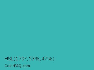 HSL 179°,53%,47% Color is a normal cyan color and the nearest color is Verdigris #43b3ae. Hex code #38b7b5 and RGB value is rgb(56,183,181). In RGB color space, this color is composed of 22% red, 72% green, 71% blue, In CMYK color space, this color is composed of 69% cyan, 0% magenta, 1% yellow , 28% black , In HSL color space, this color has a hue angle of 179° , 53% saturation and 47% lightness.