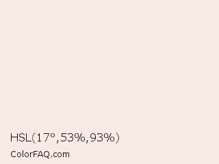 HSL 17°,53%,93% Color is a very light orange color and the nearest color is Pot Pourri #f5e7e2. Hex code #f7e9e4 and RGB value is rgb(247,233,228). In RGB color space, this color is composed of 97% red, 91% green, 89% blue, In CMYK color space, this color is composed of 0% cyan, 6% magenta, 8% yellow , 3% black , In HSL color space, this color has a hue angle of 17° , 53% saturation and 93% lightness.