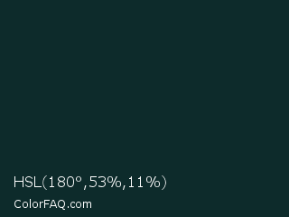 HSL 180°,53%,11% Color is a very dark cyan color and the nearest color is Firefly #0e2a30. Hex code #0d2b2b and RGB value is rgb(13,43,43). In RGB color space, this color is composed of 5% red, 17% green, 17% blue, In CMYK color space, this color is composed of 70% cyan, 0% magenta, 0% yellow , 83% black , In HSL color space, this color has a hue angle of 180° , 53% saturation and 11% lightness.