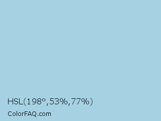 HSL 198°,53%,77% Color is a light blue color and the nearest color is Regent St Blue #aad6e6. Hex code #a5d1e3 and RGB value is rgb(165,209,227). In RGB color space, this color is composed of 65% red, 82% green, 89% blue, In CMYK color space, this color is composed of 27% cyan, 8% magenta, 0% yellow , 11% black , In HSL color space, this color has a hue angle of 198° , 53% saturation and 77% lightness.