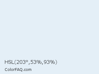 HSL 203°,53%,93% Color is a very light blue color and the nearest color is Glitter #e6e8fa. Hex code #e4eff7 and RGB value is rgb(228,239,247). In RGB color space, this color is composed of 89% red, 94% green, 97% blue, In CMYK color space, this color is composed of 8% cyan, 3% magenta, 0% yellow , 3% black , In HSL color space, this color has a hue angle of 203° , 53% saturation and 93% lightness.