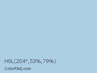 HSL 204°,53%,79% Color is a light blue color and the nearest color is Regent St Blue #aad6e6. Hex code #adcfe6 and RGB value is rgb(173,207,230). In RGB color space, this color is composed of 68% red, 81% green, 90% blue, In CMYK color space, this color is composed of 25% cyan, 10% magenta, 0% yellow , 10% black , In HSL color space, this color has a hue angle of 204° , 53% saturation and 79% lightness.