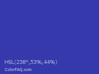 HSL 238°,53%,44% Color is a normal blue color and the nearest color is Governor Bay #2f3cb3. Hex code #3539ac and RGB value is rgb(53,57,172). In RGB color space, this color is composed of 21% red, 22% green, 67% blue, In CMYK color space, this color is composed of 69% cyan, 67% magenta, 0% yellow , 33% black , In HSL color space, this color has a hue angle of 238° , 53% saturation and 44% lightness.